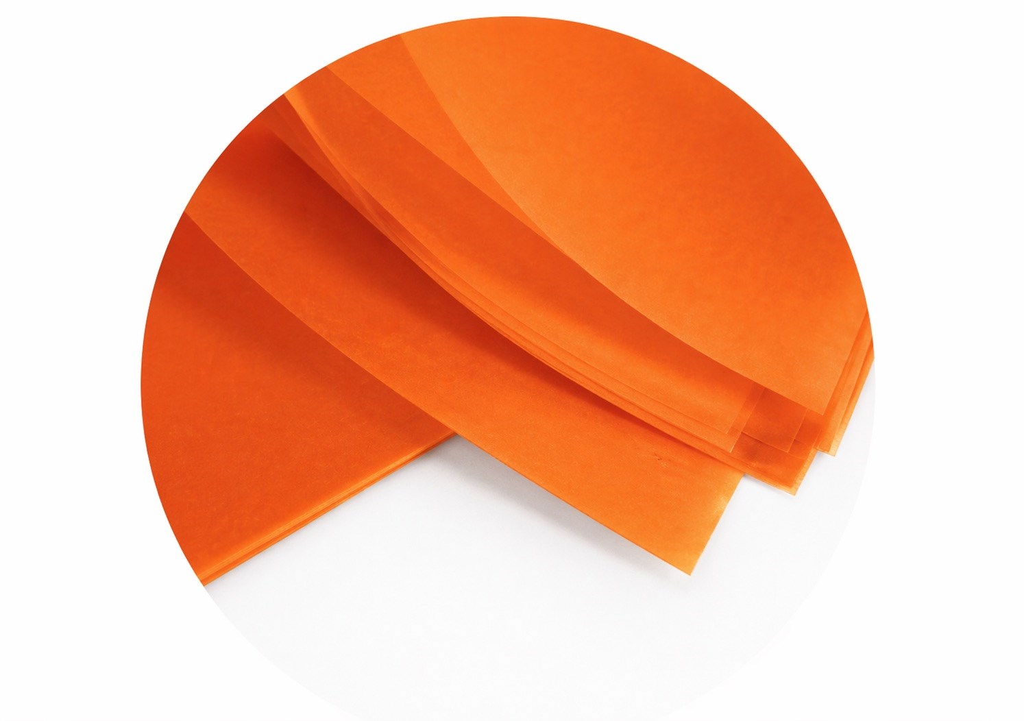 Zestaw bibuły dekoracyjnej w kolorze pomarańczowym o wymiarach 50 × 75 cm zawiera 48 arkuszy lekkiego materiału do pakowania i dekoracji.