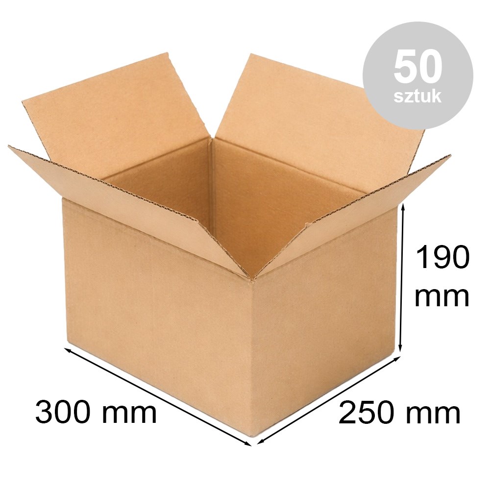 Zestaw 50 sztuk kartonów klapowych w kolorze brązowym o wymiarach 300×250×190 mm przeznaczonych do pakowania oraz transportu produktów. Wykonane z tektury 3-warstwowej o gramaturze 360 g/m² z falą B, zapewniają ochronę zawartości. Dodatkowo konstrukcja klapowa umożliwia szybkie zamknięcie kartonu przy użyciu taśmy.