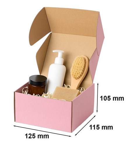 Różowy karton wykrojnikowy o wymiarach 125×115×105 mm przeznaczony jest do pakowania drobnych produktów wymagających estetycznej i bezpiecznej oprawy. Konstrukcja Fefco 426 umożliwia szybkie składanie bez użycia taśmy klejącej. Tektura falista 3-warstwowa o fali B zapewnia odpowiednią sztywność i ochronę zawartości podczas transportu oraz przechowywania.