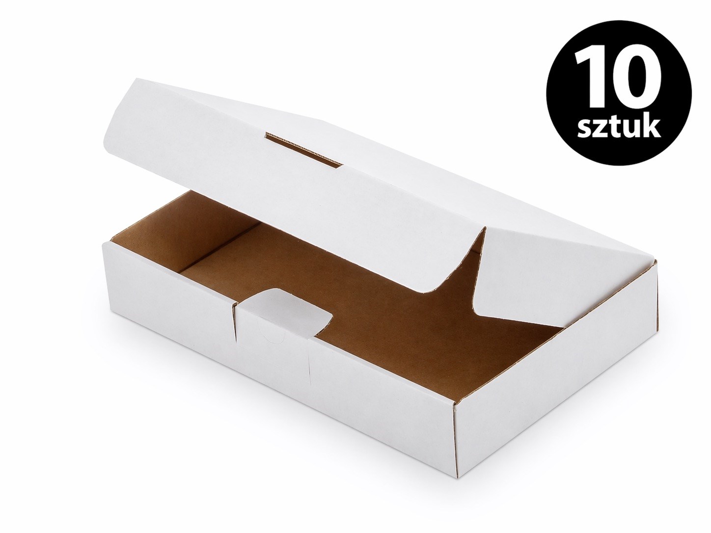 Zestaw 10 sztuk kartonów wykrojnikowych o wymiarach 200 × 150 × 50 mm w kolorze białym przeznaczony do pakowania i transportu produktów o niewielkiej wysokości.