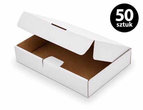 Zestaw 50 sztuk kartonów wykrojnikowych o wymiarach 200 × 150 × 50 mm w kolorze białym przeznaczony do pakowania i transportu produktów o niewielkiej wysokości.