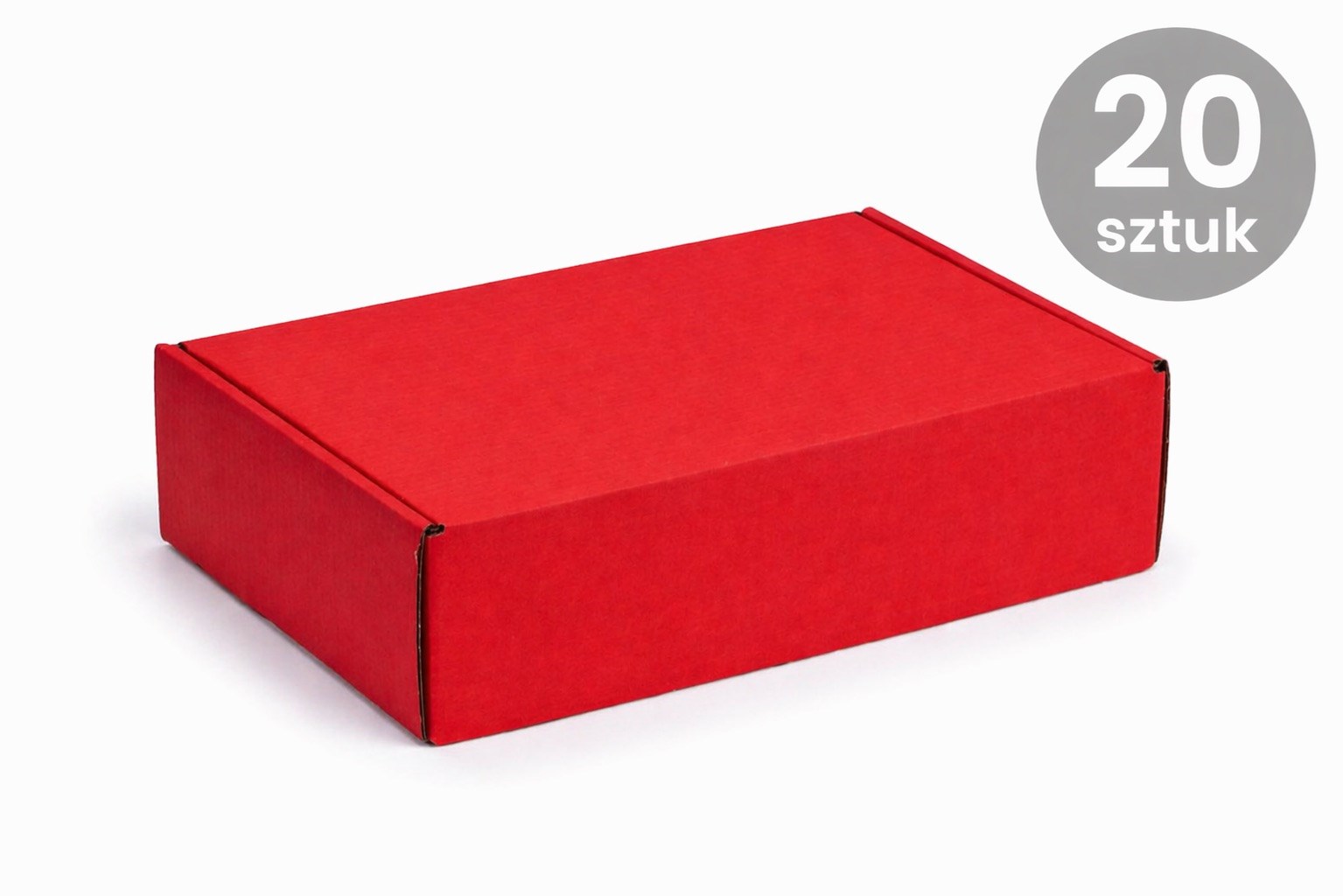 Zestaw 20 sztuk kartonów fasonowych (wykrojnikowych) w kolorze czerwonym o wymiarach 330×250×100 mm. Opakowania wykonane są z tektury falistej o strukturze fala E i gramaturze 350 g/m², dzięki czemu zapewniają estetyczny wygląd oraz ochronę pakowanych produktów. Dodatkowo konstrukcja wykrojnikowa pozwala na szybkie przygotowanie kartonu do użycia bez konieczności stosowania taśmy.