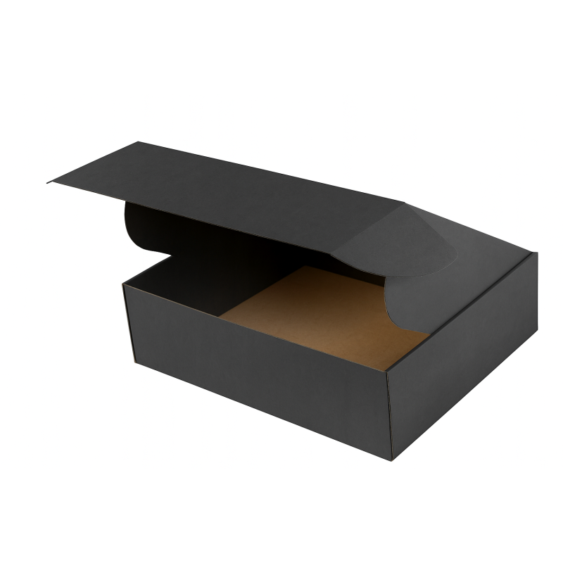 Czarny karton fasonowy o wymiarach 395×315×125 mm(zew) to funkcjonalne opakowanie przeznaczone do pakowania i wysyłki różnych produktów. Wykonany z tektury falistej trzywarstwowej fala E 420 g/m², zapewnia stabilność konstrukcji oraz ochronę zawartości podczas transportu.