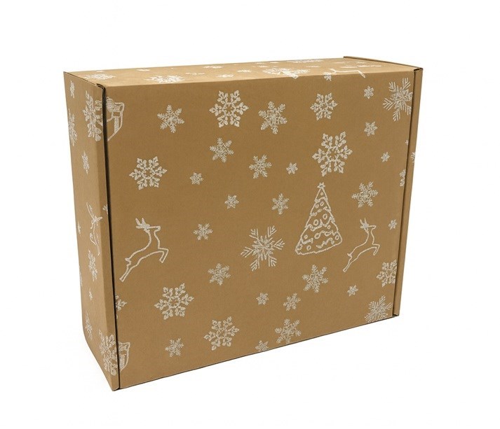 Szary karton fasonowy z białym, świątecznym nadrukiem to solidne i funkcjonalne opakowanie na prezenty oraz przesyłki w okresie Bożego Narodzenia. Wykonany z trwałej tektury falistej, skutecznie chroni zawartość i zapewnia estetyczną prezentację podczas wysyłki.