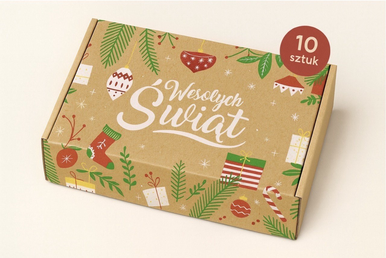 Eleganckie pudełko fasonowe w kolorze kraft z napisem „Wesołych Świąt” to idealny wybór na świąteczne paczki i prezenty. Łączy praktyczność solidnej konstrukcji z dekoracyjnym charakterem, dzięki czemu sprawdzi się zarówno w domu, jak i w sprzedaży online.