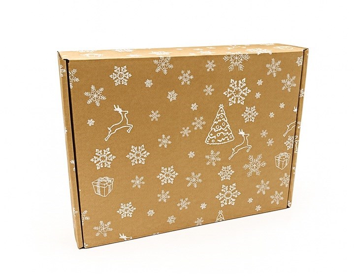 Szary karton fasonowy z białym nadrukiem świątecznych reniferów, choinek i śnieżynek to praktyczne oraz eleganckie opakowanie na prezenty. Wykonany z wytrzymałej tektury falistej, zapewnia bezpieczeństwo zawartości i wyjątkowy wygląd w okresie Bożego Narodzenia.