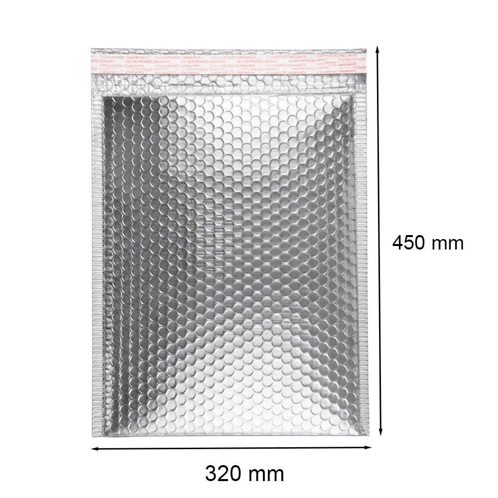 Metaliczne koperty bąbelkowe pokryte są folią polietylenową na zewnątrz i pęcherzykową od wewnątrz. Mają wiele zalet, wśród których najważniejsze to: wysoka skuteczność w zabezpieczaniu zawartości i bardzo efektowny wygląd. Zamknięcie za pomocą paska samoprzylepnego przyśpiesza czas pakowania i wysyłki. Lekka waga nie wpływa na wagę przesyłki i koszt jej nadania. Nadają się do przesyłania przedmiotów o rozmiarach odpowiadających formatowi A3.