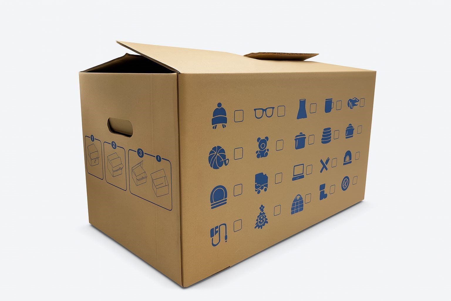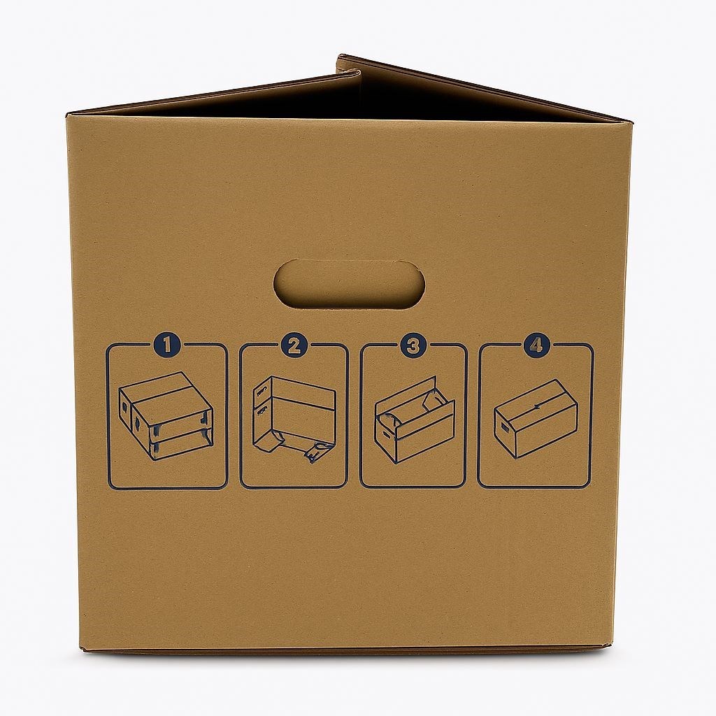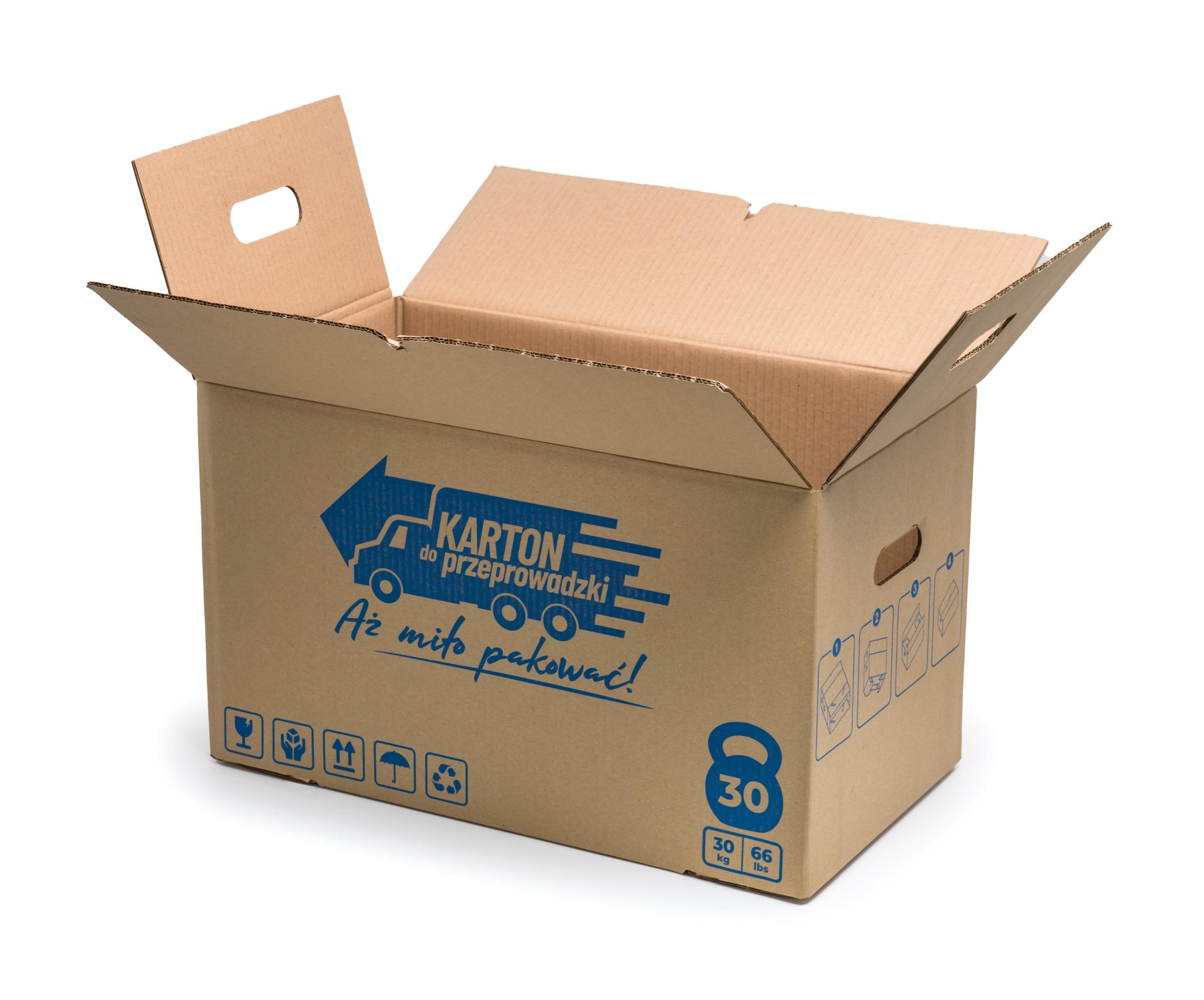 Pudełko przeprowadzkowe EB580 w rozmiarze 550 × 300 × 320 mm to wyjątkowo trwałe opakowanie z 5-warstwowej tektury falistej (fala EB). Posiada uchwyty transportowe, nadruki organizacyjne oraz instrukcję składania, co czyni je niezastąpionym przy przeprowadzkach i profesjonalnym w e-commerce.