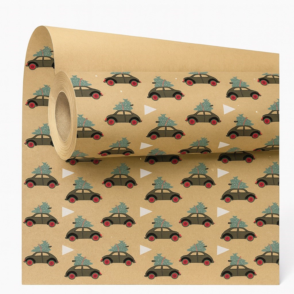 Papier ozdobny kraft – świąteczny motyw samochodów z choinką 0,69 × 50 m