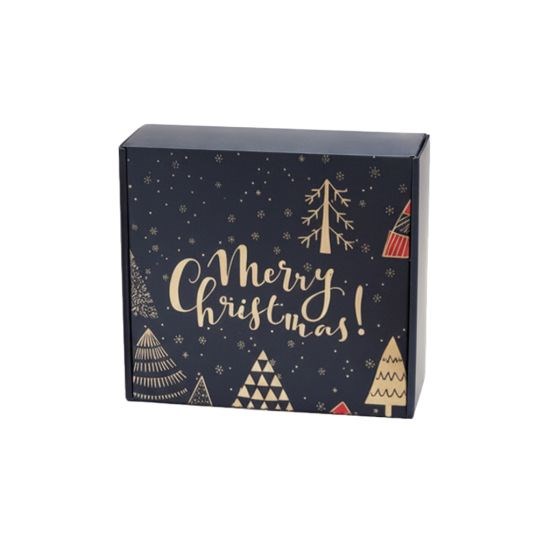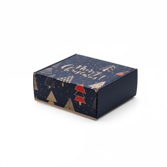 Karton fasonowy z nadrukiem 190×180×70 mm – granatowy, motyw świąteczny z choinką