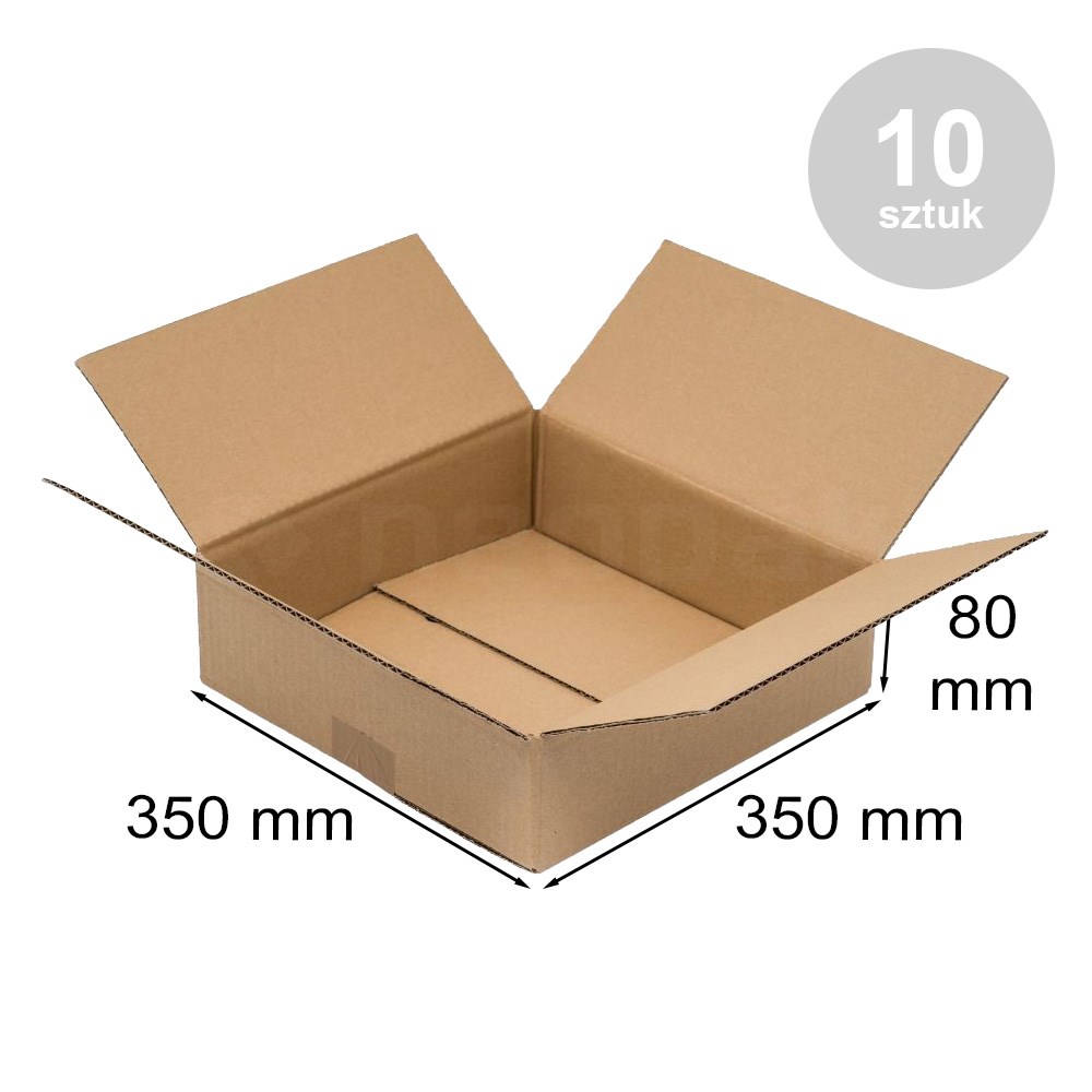 Solidne pudełko klapowe 350x350x80 mm wykonane z trwałej tektury falistej B360, przeznaczone do pakowania płaskich i średniej wielkości produktów. Format kartonu umożliwia bezpieczną wysyłkę dokumentów, elementów wyposażenia, odzieży oraz zestawów sprzedażowych. Stabilna konstrukcja zapewnia odpowiednią ochronę zawartości w transporcie. Opakowanie zawiera 10 sztuk kartonów.