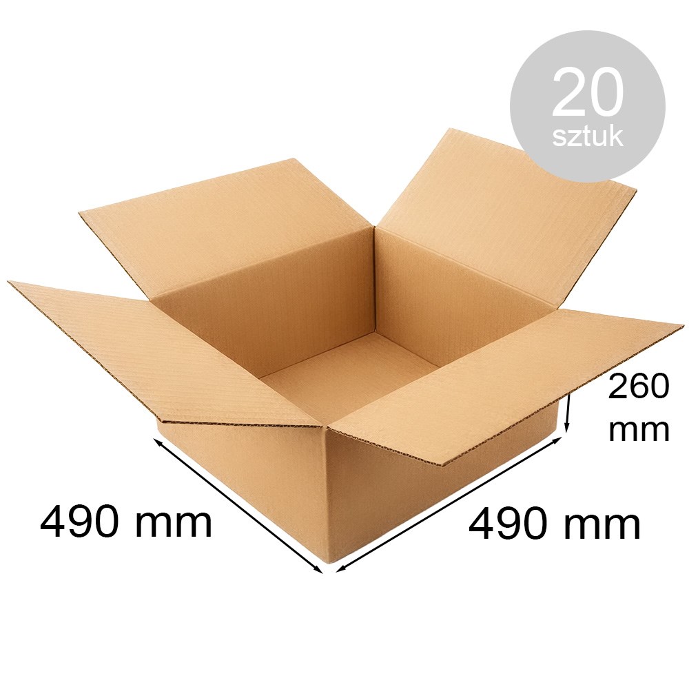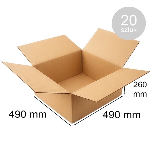 Mocne pudełko klapowe 490x490x260 mm wykonane z solidnej tektury falistej BC580, zaprojektowane do pakowania dużych i wymagających produktów. Podwójna fala zapewnia bardzo dobrą odporność na zgniatanie, co sprawia, że karton doskonale sprawdza się w logistyce, magazynach oraz sprzedaży internetowej. Opakowanie zawiera 20 sztuk kartonów.