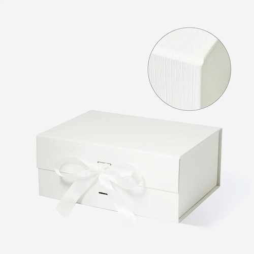 Jasny odcień off white nadaje pudełku subtelny i elegancki wygląd. Lniana faktura powierzchni wzmacnia wrażenie naturalnej estetyki. Magnetyczna klapka pozostaje niemal niewidoczna, zachowując spójną bryłę. Dekoracyjna wstążka stanowi delikatny akcent wizualny.