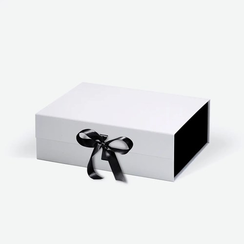 Pudełko prezentowe magnetyczne A4 białe z czarnym wnętrzem z wstążką 330×255×115 mm