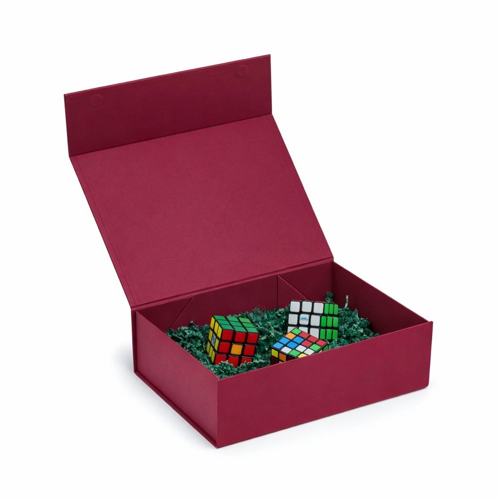 Burgundowe pudełko magnetyczne w odcieniu Pantone 209C wyróżnia się elegancką, nasyconą kolorystyką i prostą, uporządkowaną formą. Magnetyczne domknięcie podkreśla estetyczny charakter opakowania, a sztywna, lita tektura o gramaturze 850 g/m² nadaje całości solidny wygląd. Opakowanie dobrze prezentuje się jako oprawa zestawów przygotowanych do wręczenia.