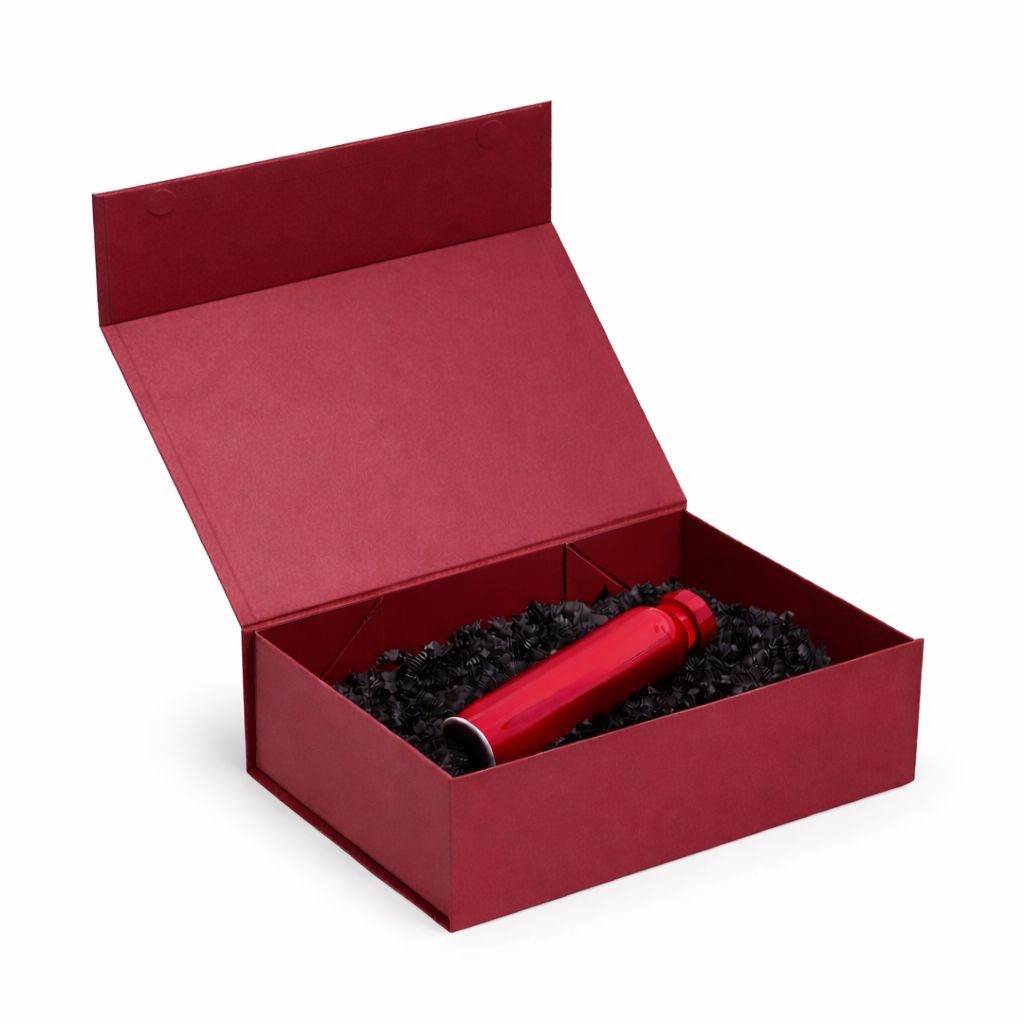 Pudełko przeznaczone jest do efektownej prezentacji większych produktów oraz rozbudowanych zestawów firmowych i prezentowych. Bordowy kolor wzmacnia wrażenie jakości i ekskluzywności opakowania.