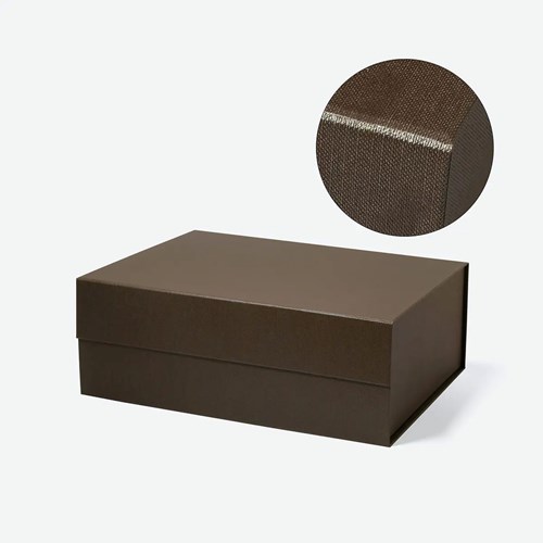 Głęboki brązowy odcień nadaje pudełku elegancki i naturalny wygląd. Proporcjonalna, głęboka bryła prezentuje się solidnie i estetycznie. Matowa powierzchnia podkreśla uporządkowany i minimalistyczny charakter opakowania. Ukryte magnesy nie zakłócają spójnej formy pudełka.