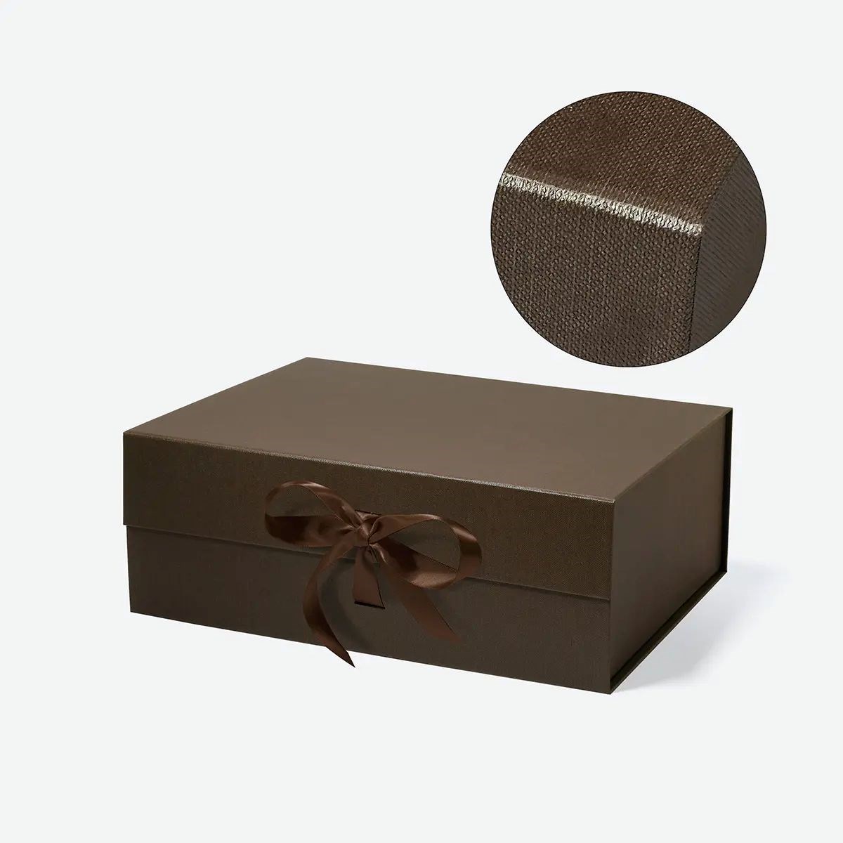Głęboki brązowy kolor nadaje pudełku elegancki i naturalny wygląd. Proporcjonalna, głęboka bryła prezentuje się solidnie i prestiżowo. Matowa powierzchnia podkreśla minimalistyczny charakter opakowania. Dekoracyjna wstążka stanowi subtelny akcent wizualny.