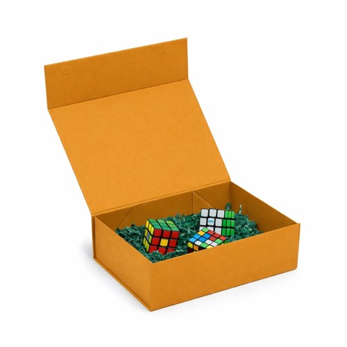 Pudełko magnetyczne o wymiarach 350×250×100 mm przeznaczone jest do estetycznego pakowania produktów oraz zestawów wymagających stabilnej i uporządkowanej oprawy. Sztywna, lita tektura o gramaturze 850 g/m² zapewnia ochronę zawartości podczas transportu i przechowywania. Składana konstrukcja ułatwia magazynowanie pudełek przed użyciem oraz sprawne przygotowanie opakowania. Bursztynowy kolor Pantone 7550C nadaje całości ciepły i wyrazisty charakter.