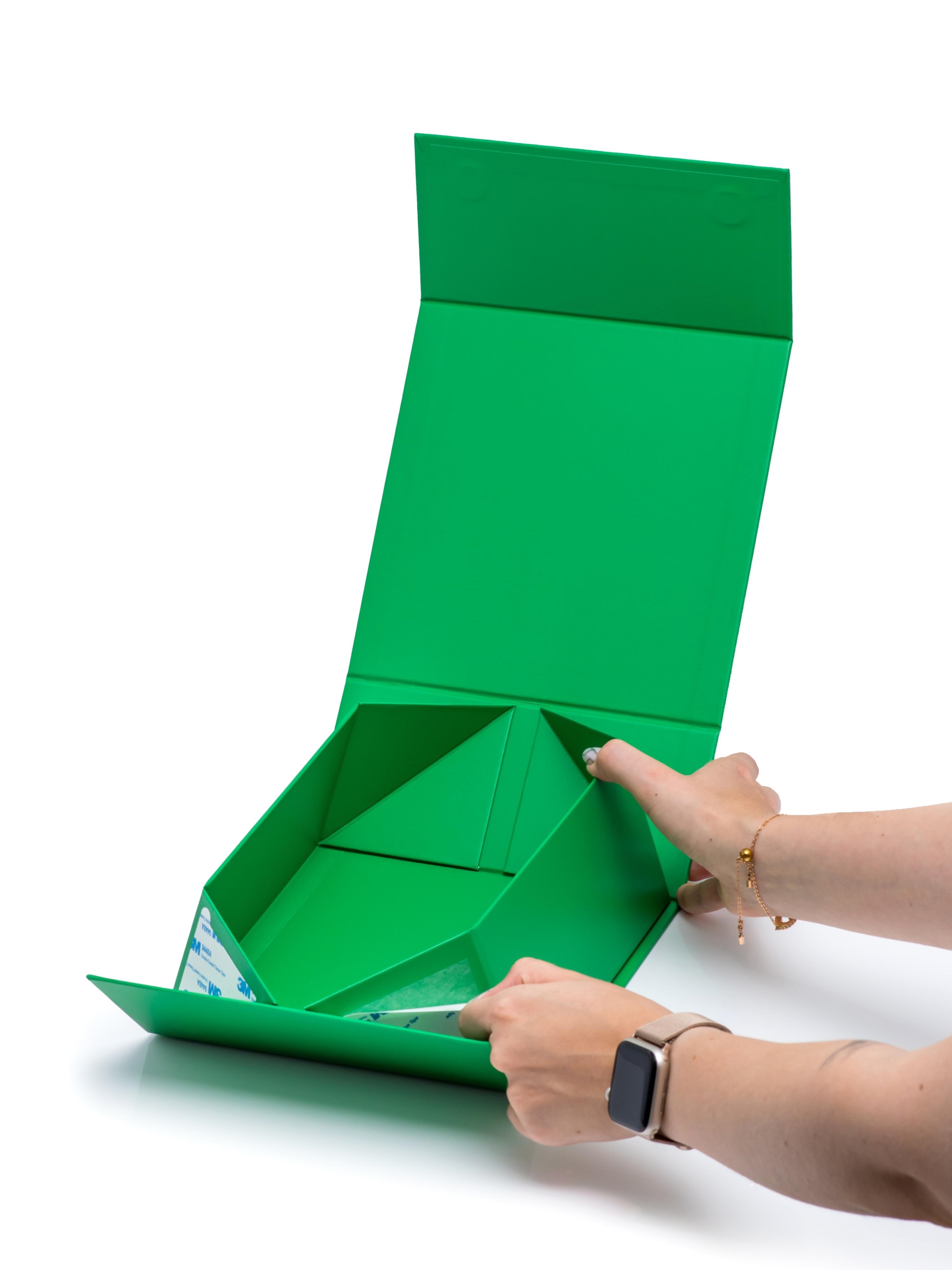 Eleganckie pudełko magnetyczne o wymiarach 200x200x90 mm w klasycznym odcieniu ciemnej zieleni (zbliżonym do Pantone 347U) to propozycja dla tych, którzy chcą łączyć estetykę z praktycznością. Wyposażone w trwały klej 3M i wykonane z wysokiej jakości materiału, świetnie nadaje się do pakowania drobnych, ale wartościowych produktów.