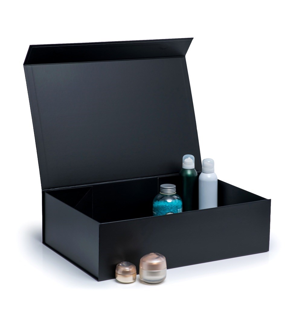 Przestronne, czarne pudełko prezentowe o wymiarach 500 × 340 × 145 mm, idealne do pakowania większych i wymagających produktów. Wykonane z wytrzymałych materiałów, z matowym, odpornym na zarysowania wykończeniem oraz praktycznym, półmagnetycznym zamknięciem, które zapewnia styl i bezpieczeństwo.