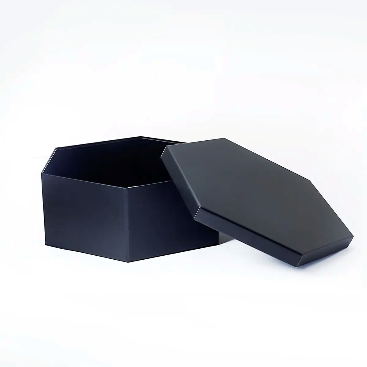 Czarne pudełko magnetyczne o sześciokątnym kształcie wyróżnia się nowoczesną, geometryczną formą oraz wyraźnie zaznaczonymi krawędziami. Symetryczne proporcje nadają opakowaniu elegancki i uporządkowany wygląd, a zdejmowana pokrywa pozwala na estetyczną prezentację zawartości.