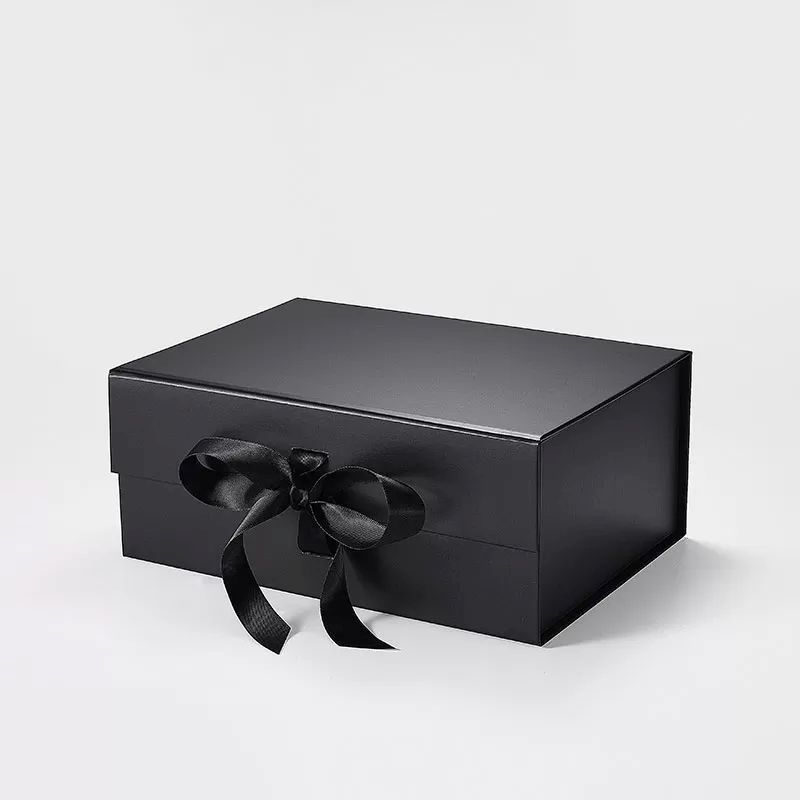 Matowa czerń nadaje pudełku elegancki i wyrazisty charakter. Prosta bryła w połączeniu z gładką powierzchnią tworzy spójną, nowoczesną formę. Dyskretnie ukryte magnesy zapewniają schludne wykończenie. Dekoracyjna wstążka stanowi subtelny, estetyczny akcent.