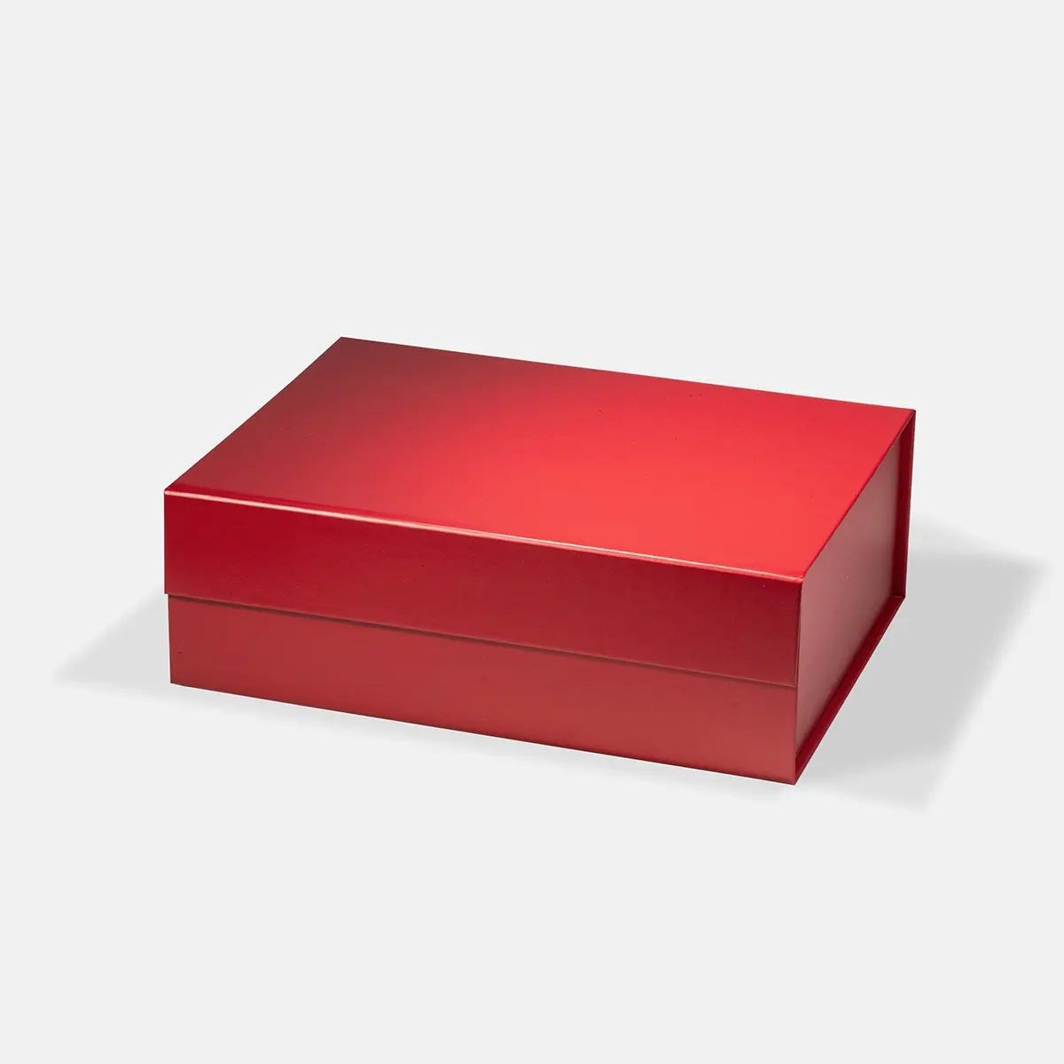 Czerwone pudełko magnetyczne w rozmiarze średnim wyróżnia się wyrazistym kolorem i uporządkowaną formą. Matowe wykończenie nadaje opakowaniu nowoczesny charakter, a ukryte magnesy w klapce podkreślają estetyczną spójność konstrukcji. Proporcjonalny format sprawia, że pudełko dobrze prezentuje większe produkty bez potrzeby dodatkowych dodatków. To opakowanie, które przyciąga uwagę i wzmacnia wizerunek produktu.