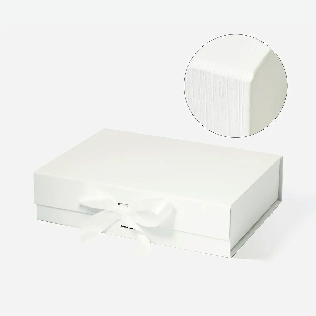 Jasny odcień off white nadaje pudełku subtelny i elegancki wygląd. Smukła, płaska bryła prezentuje się lekko i estetycznie. Delikatna struktura fine linen podkreśla jakość materiału. Dekoracyjna wstążka stanowi spójny i wyważony akcent wizualny.
