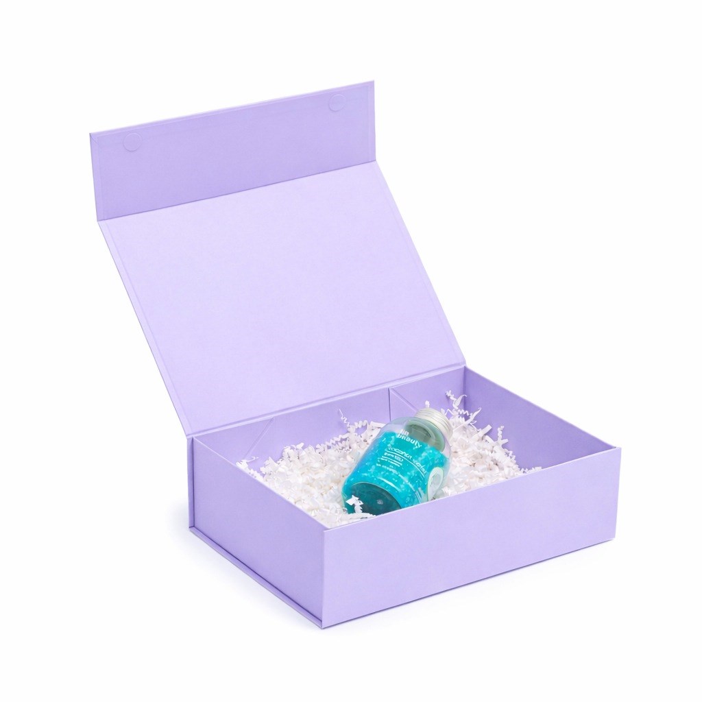 Pudełko magnetyczne w lawendowym odcieniu Pantone 7443C wyróżnia się delikatną kolorystyką i prostą, uporządkowaną formą. Magnetyczne domknięcie podkreśla estetyczny charakter opakowania, a sztywna, lita tektura o gramaturze 850 g/m² nadaje całości solidny i reprezentacyjny wygląd. Opakowanie dobrze prezentuje się jako oprawa zestawów przygotowanych do wręczenia.