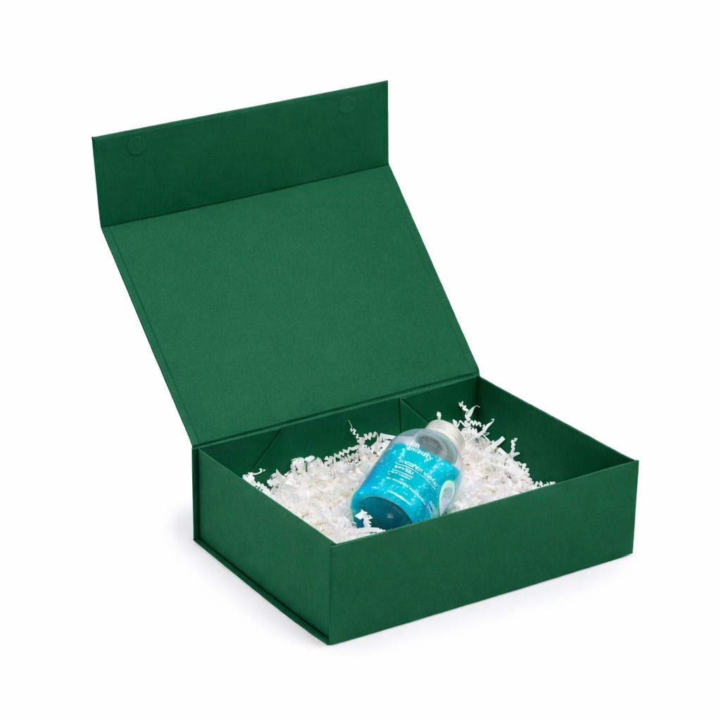 Pudełko magnetyczne w odcieniu leśnej zieleni Pantone 349C wyróżnia się stonowaną, naturalną kolorystyką oraz prostą, uporządkowaną formą. Magnetyczne domknięcie podkreśla estetyczny charakter opakowania, a sztywna, lita tektura o gramaturze 850 g/m² nadaje całości solidny i reprezentacyjny wygląd. Opakowanie dobrze prezentuje się jako oprawa zestawów przygotowanych do wręczenia.