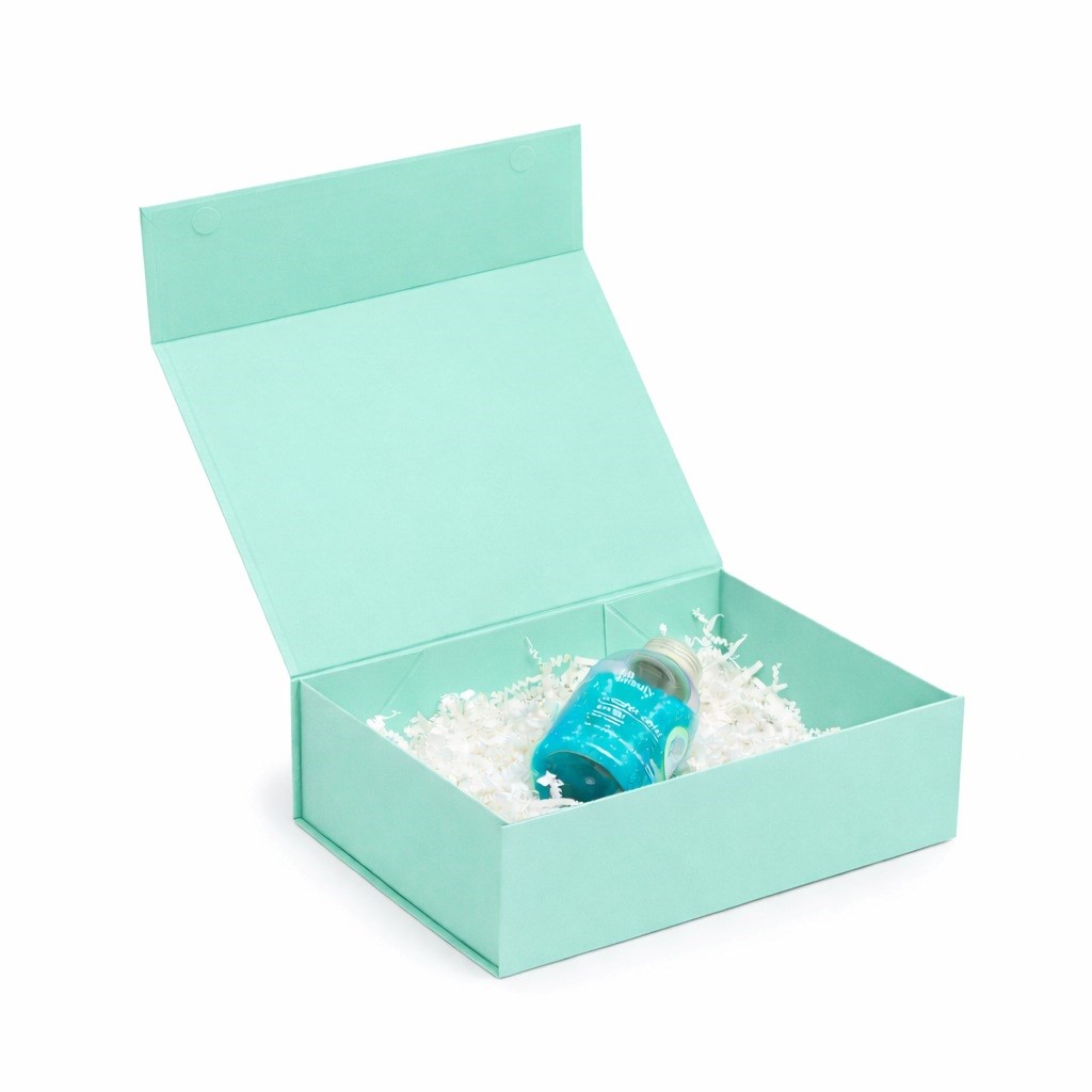 Pudełko magnetyczne w miętowym odcieniu Pantone 337C wyróżnia się lekką, świeżą kolorystyką i prostą, uporządkowaną formą. Magnetyczne domknięcie podkreśla estetyczny charakter opakowania, a sztywna, lita tektura o gramaturze 850 g/m² nadaje całości solidny i elegancki wygląd. Opakowanie dobrze prezentuje się jako oprawa zestawów przygotowanych do wręczenia.