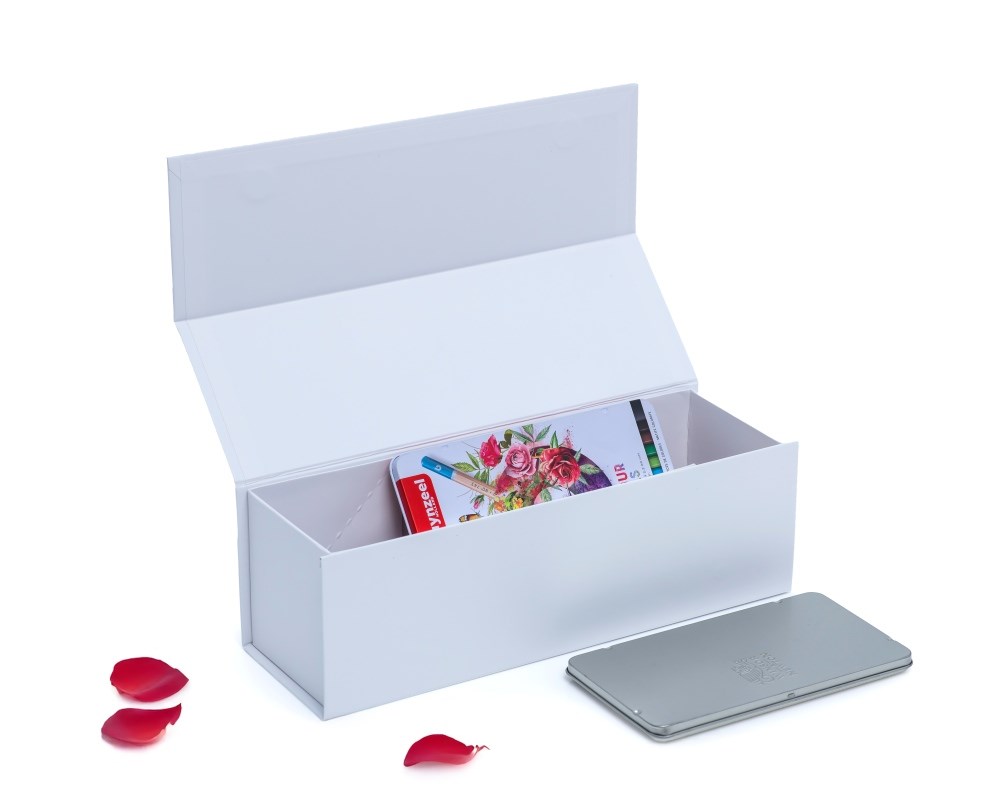 Eleganckie, białe pudełko prezentowe o wymiarach 325 × 110 × 105 mm, zaprojektowane do stylowego i bezpiecznego pakowania pojedynczych butelek wina lub innych płynów. Solidna, składana konstrukcja oraz pełne magnetyczne zamknięcie z ukrytymi magnesami gwarantują wygodę i ochronę zawartości.