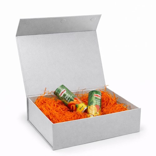 Pudełko przeznaczone jest do efektownej prezentacji produktów oraz tworzenia zestawów firmowych i prezentowych. Srebrny kolor wzmacnia wrażenie nowoczesności i wysokiej jakości opakowania.