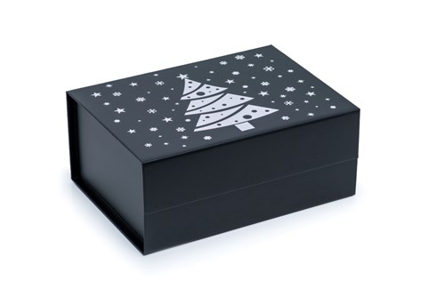 Czarne pudełko prezentowe A5 z serii świątecznej to elegancka i praktyczna forma opakowania, idealna na upominki sezonowe. Gotowe do wręczenia bez dodatkowego pakowania.
