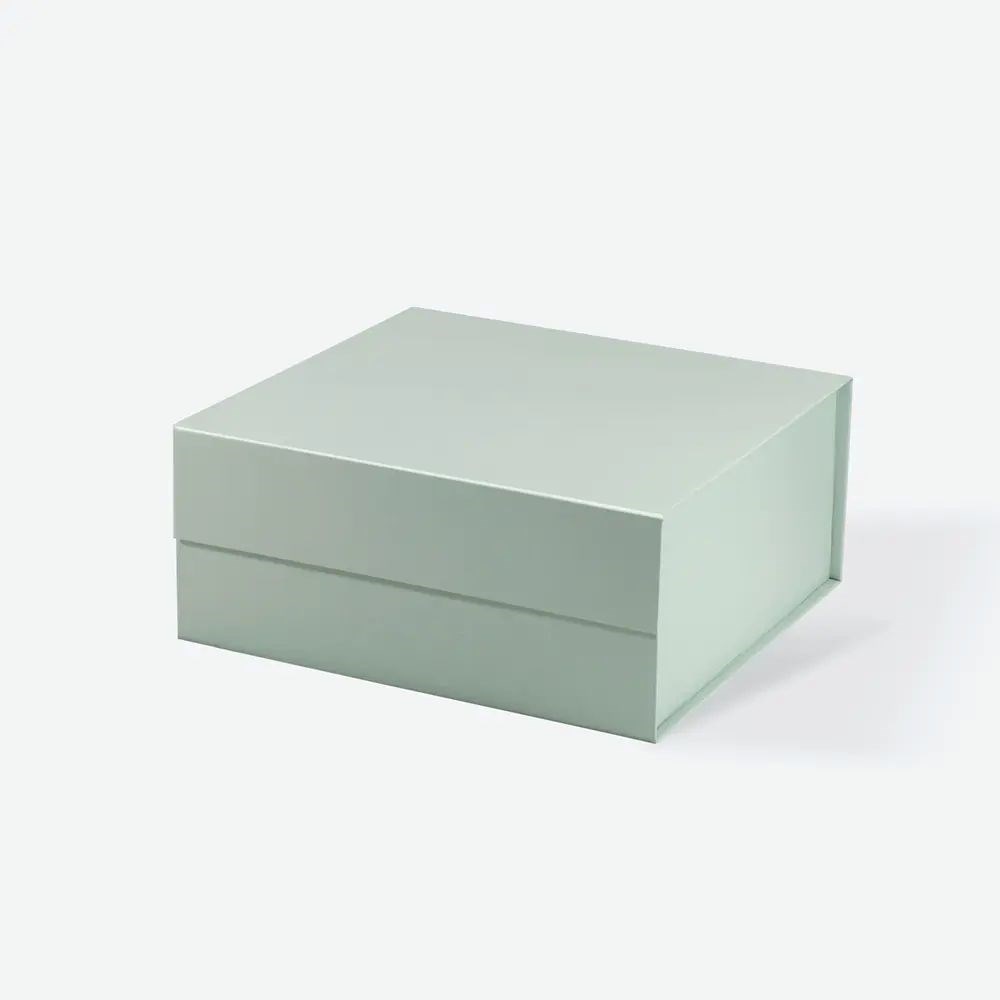 Szałwiowe pudełko magnetyczne w średnim, kwadratowym formacie wyróżnia się spokojną kolorystyką i uporządkowaną bryłą. Matowe wykończenie nadaje opakowaniu nowoczesny charakter, a ukryte magnesy w klapce zachowują estetyczną spójność konstrukcji. Duży format pozwala na elegancką prezentację masywniejszych produktów bez potrzeby dodatkowych ozdób. To opakowanie, które podkreśla naturalny, dopracowany styl zawartości.