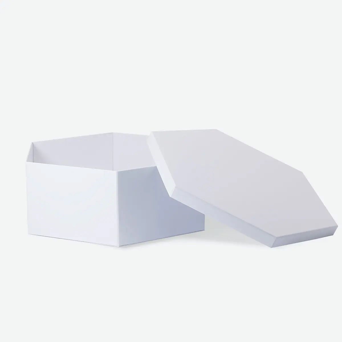 Białe pudełko magnetyczne o sześciokątnym kształcie wyróżnia się nowoczesną, geometryczną formą i jasną, uporządkowaną estetyką. Symetryczne proporcje oraz wyraźnie zaznaczone krawędzie nadają opakowaniu elegancki charakter. Zdejmowana pokrywa podkreśla spójny wygląd i umożliwia efektowną prezentację zawartości.