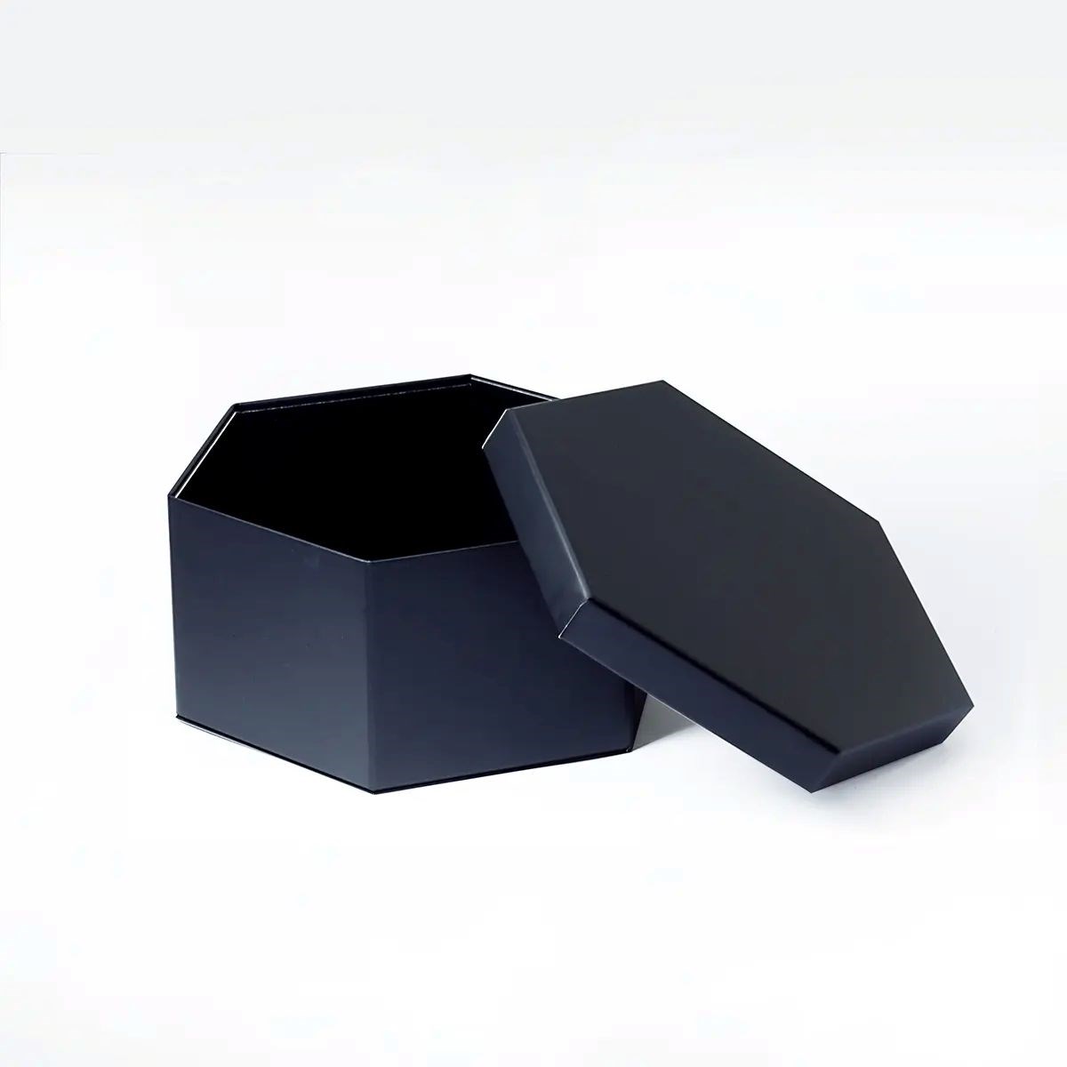 Czarne pudełko magnetyczne o sześciokątnym kształcie wyróżnia się nowoczesną, geometryczną formą oraz wyraźnie zaznaczonymi krawędziami. Symetryczne proporcje nadają opakowaniu elegancki i uporządkowany wygląd, a zdejmowana pokrywa pozwala na estetyczną prezentację zawartości.