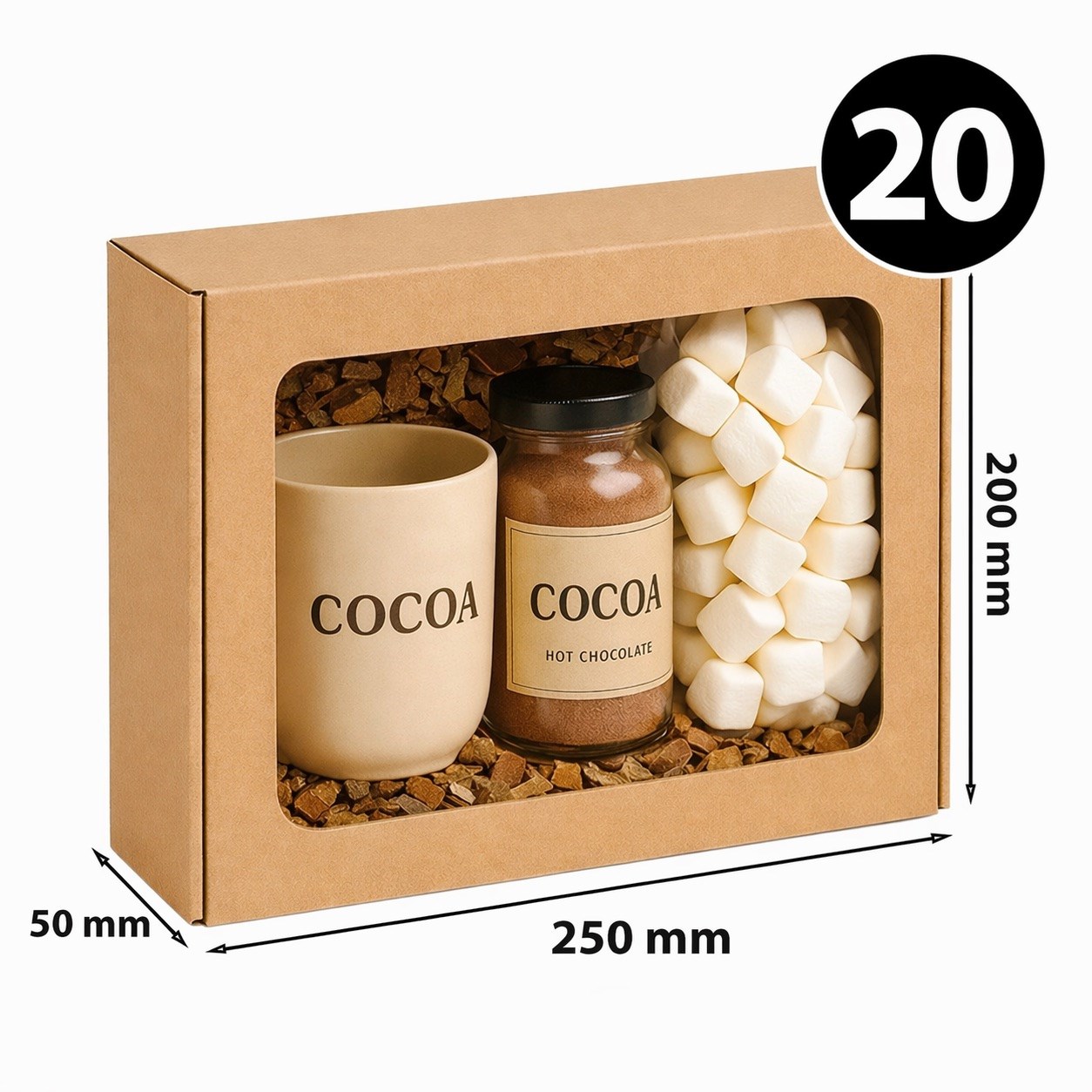 Zestaw 20 sztuk pudełek ozdobnych EKO w kolorze brązowym z przezroczystym okienkiem umożliwia pakowanie i prezentację produktów w jednym opakowaniu.