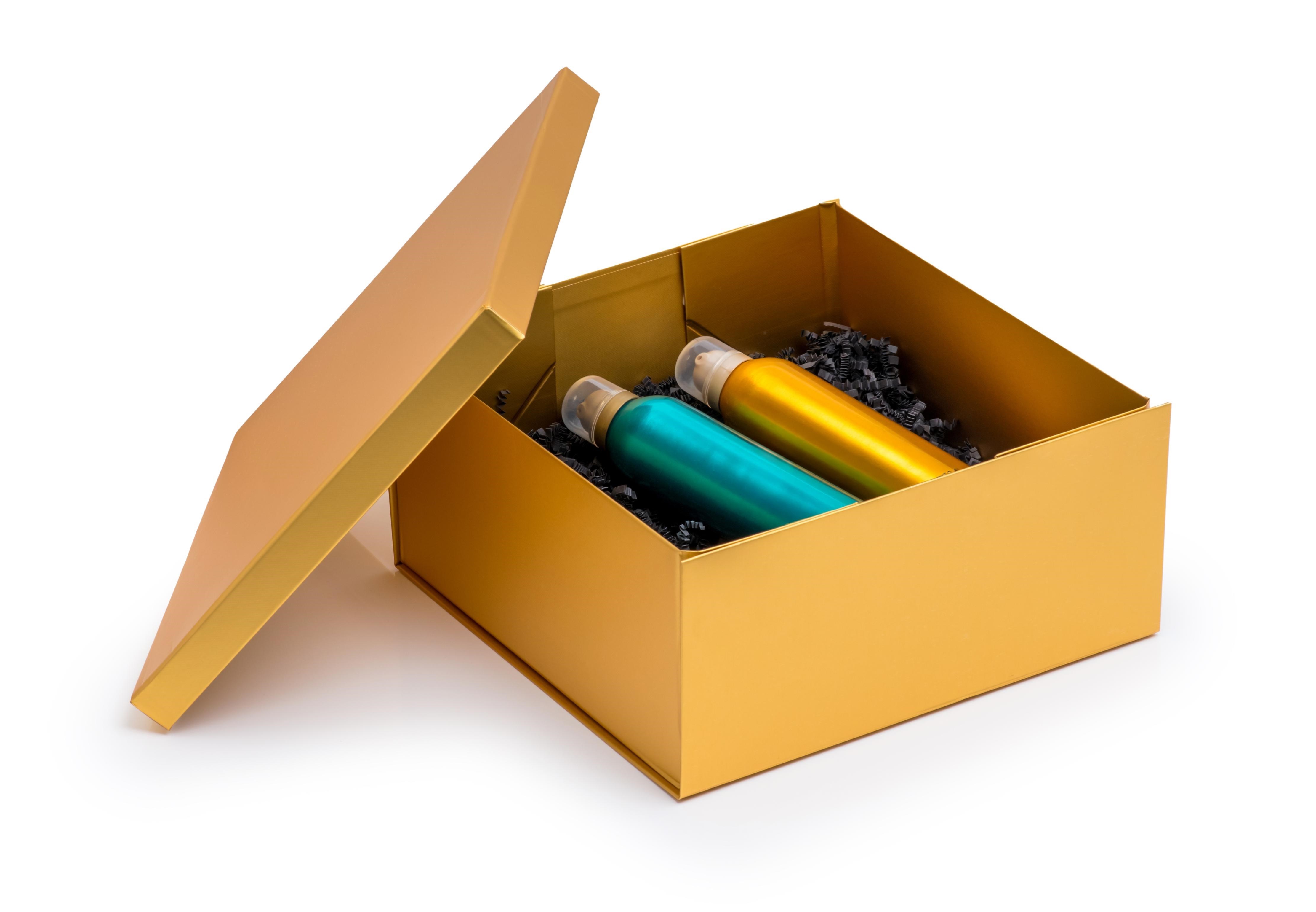 - Złoty kolor z fakturą – podkreśla ekskluzywny charakter opakowania.