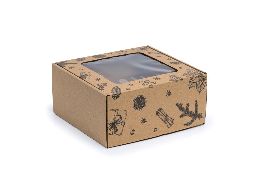 Pudełko fasonowe z okienkiem 200 × 200 × 100 mm – Nadruk Świąteczny