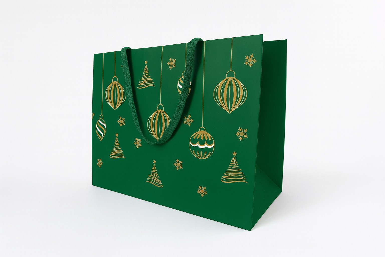 Elegancka zielona torba prezentowa KRAFT to idealny wybór na świąteczne upominki. Wykonana z papieru kraft o gramaturze 180 g/m², zachwyca naturalnym połyskiem i gładką fakturą. Płaskie uchwyty zapewniają wygodę, a głęboka zieleń torby w połączeniu z motywem świątecznym sprawia, że każde opakowanie nabiera wyjątkowego charakteru.