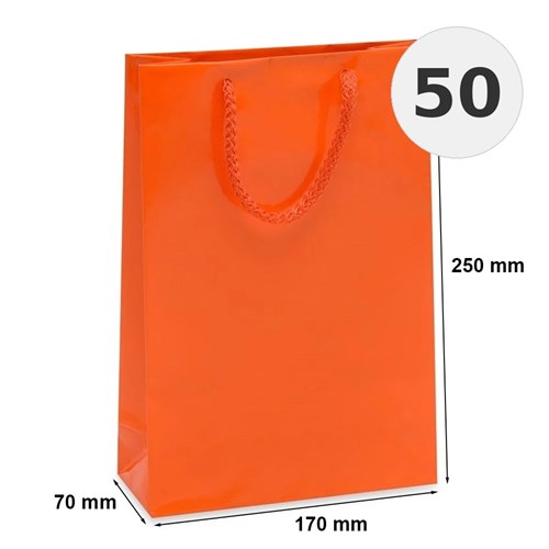 Funkcjonalna torba laminowana w kolorze pomarańczowy o wymiarach 170×70×250 mm umożliwia wygodne pakowanie produktów oraz materiałów promocyjnych.