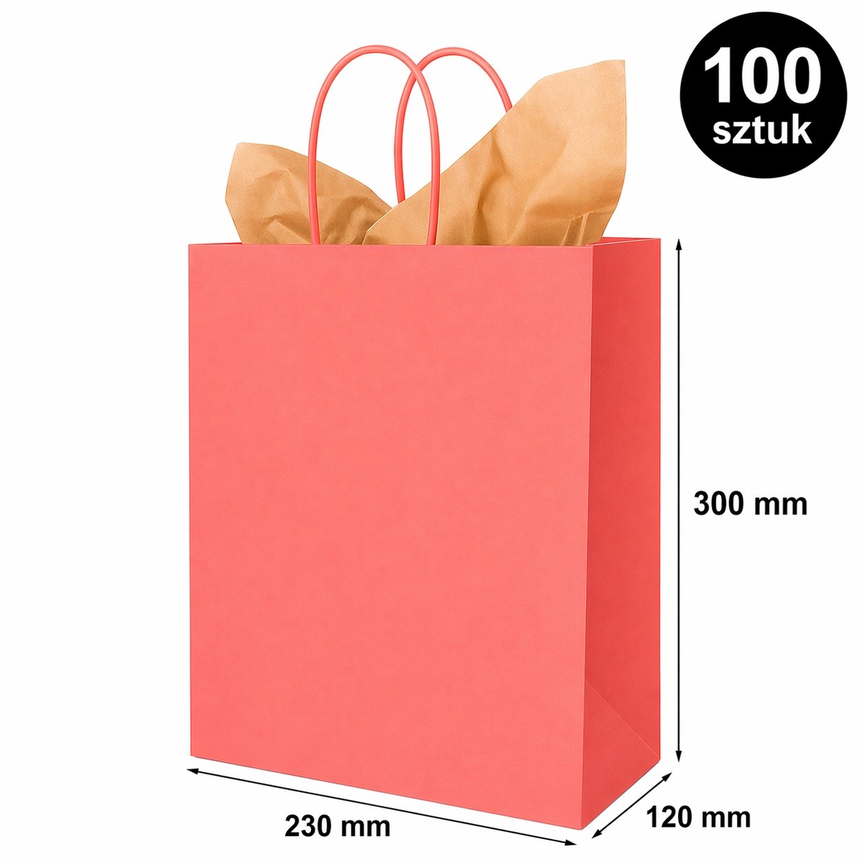 Zestaw 100 sztuk toreb papierowych ozdobnych w kolorze jasnoczerwonym o wymiarach 230 × 120 × 300 mm przeznaczonych do pakowania prezentów oraz produktów.