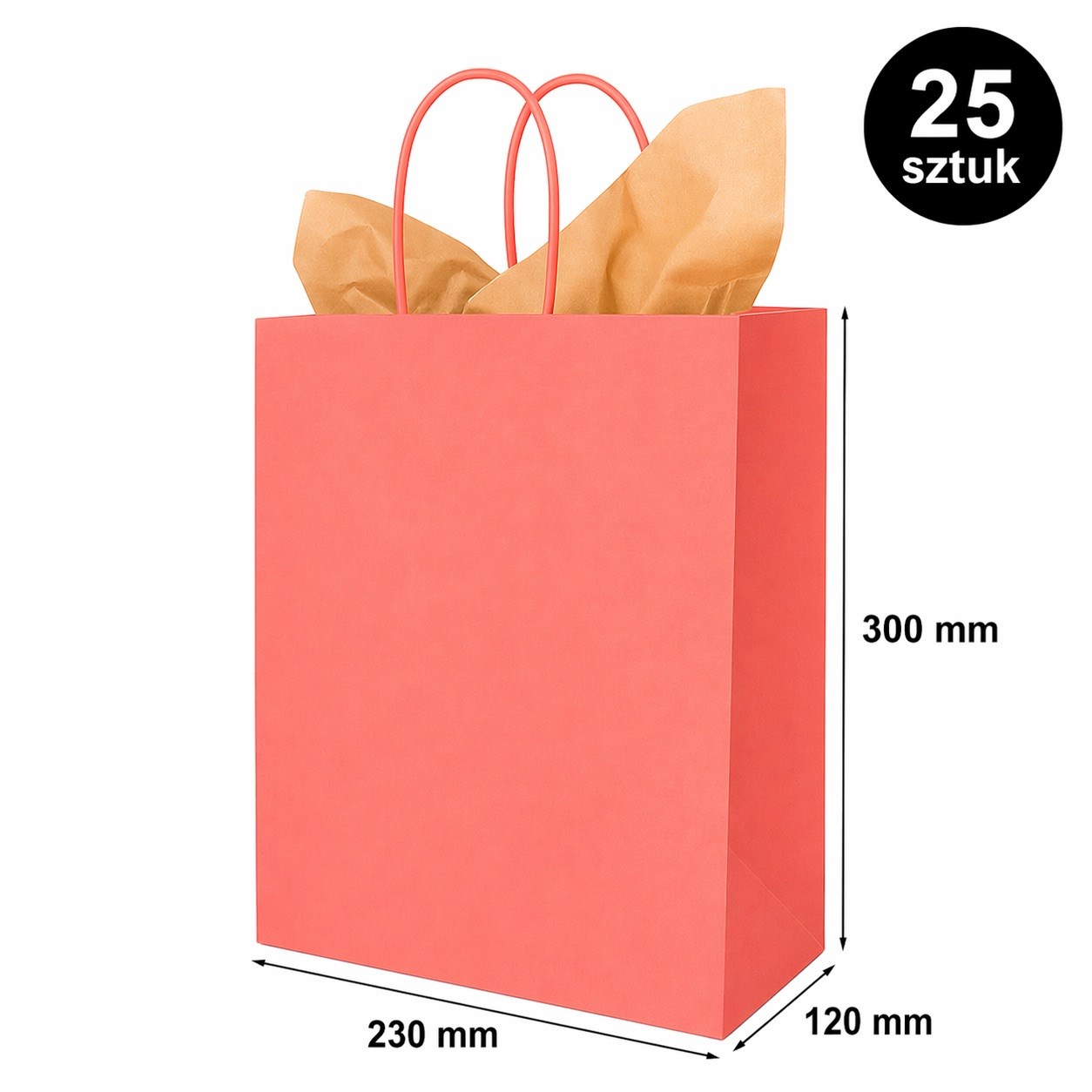 Zestaw 25 sztuk toreb papierowych ozdobnych w kolorze jasnoczerwonym o wymiarach 230 × 120 × 300 mm przeznaczonych do pakowania prezentów oraz produktów.