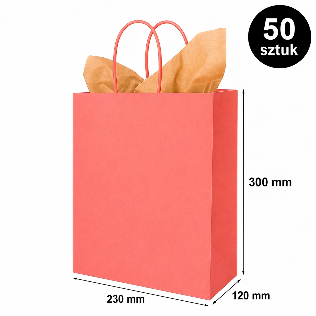 Zestaw 50 sztuk toreb papierowych ozdobnych w kolorze jasnoczerwonym o wymiarach 230 × 120 × 300 mm przeznaczonych do pakowania prezentów oraz produktów.