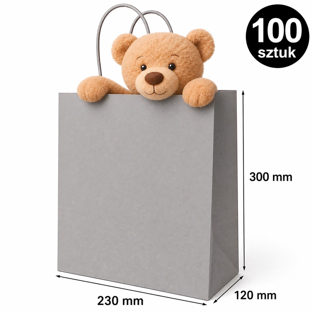Zestaw 100 sztuk toreb papierowych ozdobnych w kolorze szarym o wymiarach 230 × 120 × 300 mm przeznaczonych do pakowania prezentów oraz produktów.
