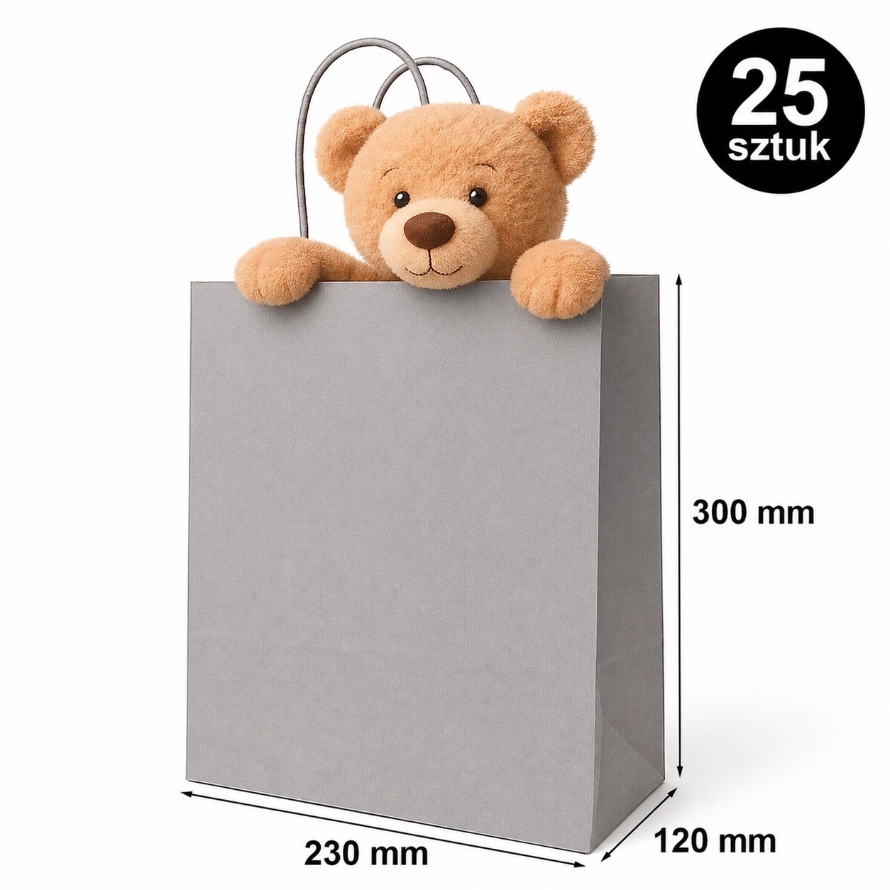 Zestaw 25 sztuk toreb papierowych ozdobnych w kolorze szarym o wymiarach 230 × 120 × 300 mm przeznaczonych do pakowania prezentów oraz produktów.
