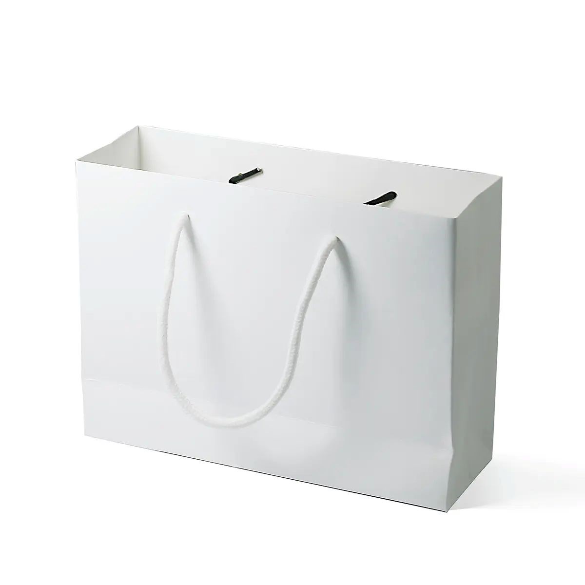 Biała torba papierowa kraft w formacie 203×63,5×153 mm wyróżnia się prostą formą i czystą, neutralną estetyką. Gładka powierzchnia papieru stanowi dobre tło dla nadruków oraz złocenia folią. Wymienne uchwyty pozwalają dopasować wygląd torby do charakteru marki lub okazji. Całość prezentuje się lekko i profesjonalnie.