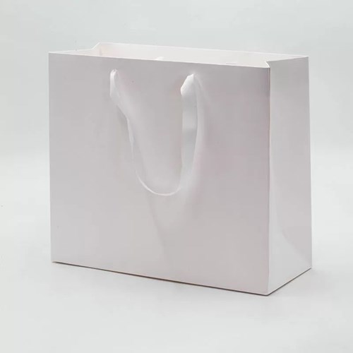 Biała powierzchnia papieru kraft nadaje torbie czysty i profesjonalny wygląd. Prosta forma dobrze eksponuje zapakowane pudełka i zestawy, zachowując spójność wizualną. Naturalna struktura papieru podkreśla estetykę opakowań premium. To uniwersalne rozwiązanie, które łatwo dopasować do różnych stylów brandingu.